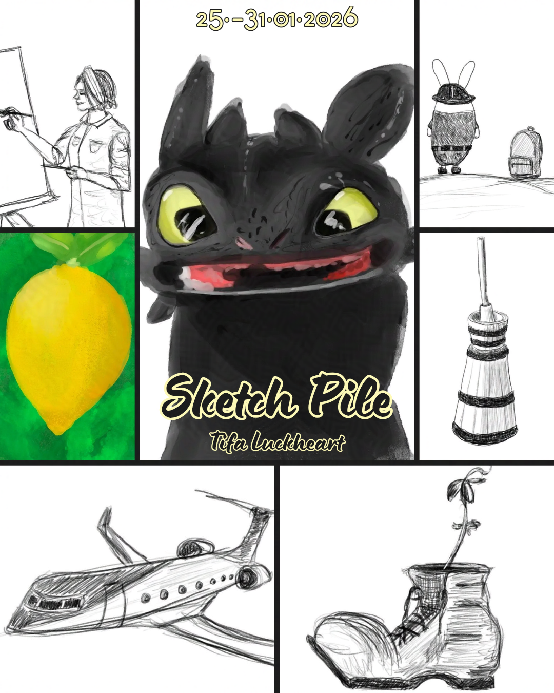Alt Text: Digital sketches: drawing of a painter working on a new piece, a lemon, a plane flying, Toothless the dragon awkwardly smiling, a little bunny adventurer next to his backpack, a butter churn, the old shoe with a plant in it from WALL-E.