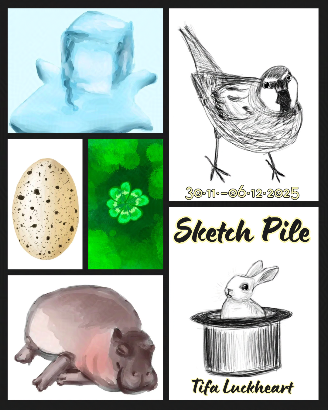 Alt Text: Digital sketches: drawing of an ice cube melting, a speckled egg, a lucky four-leaf clover, a sleeping hippo, a bold little sparrow, a bunny in a magical tophat.