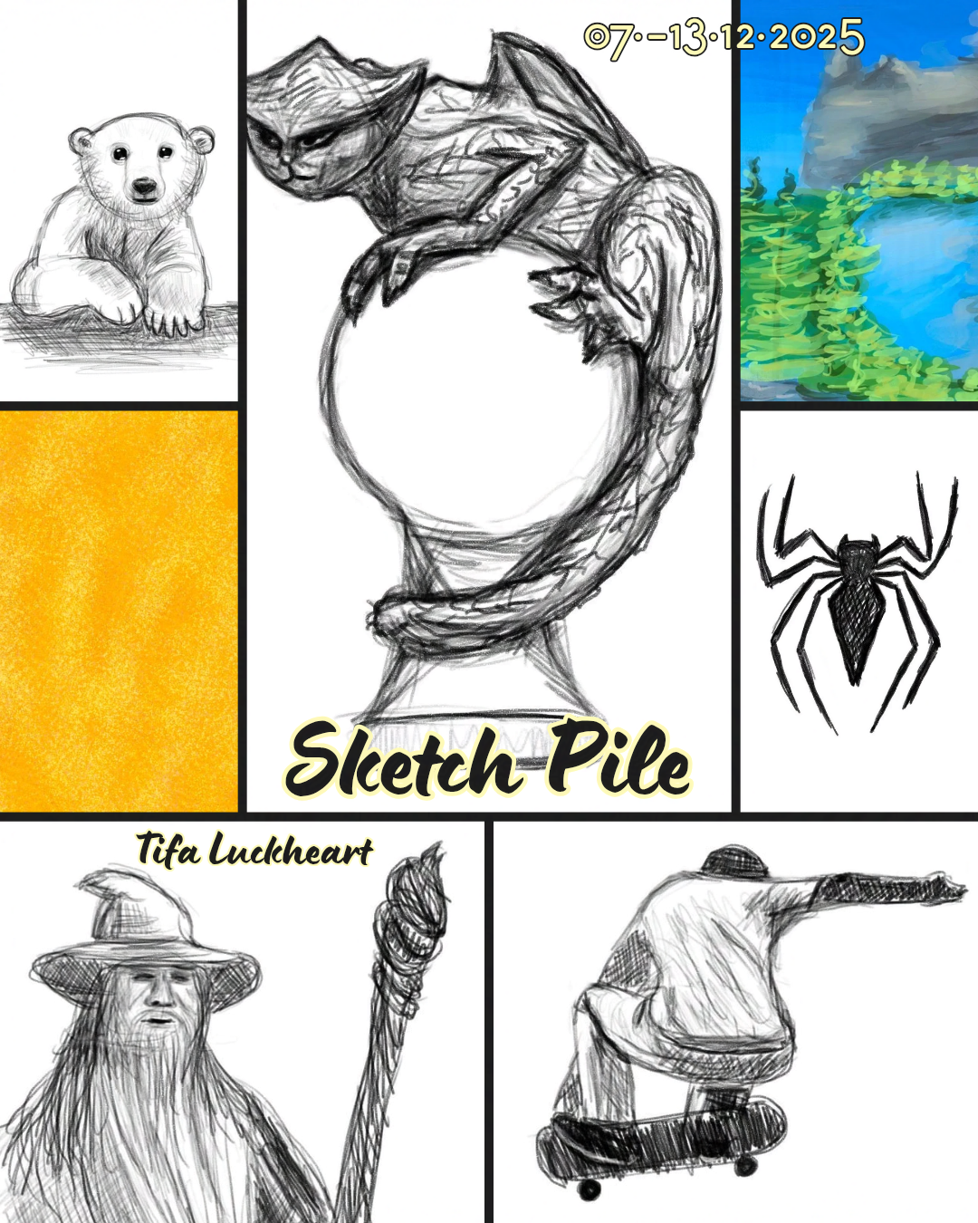 Alt Text: Digital sketches: drawing of a polar bear, golden colors, Gandalf from LOTR, a gargoyle on a stone ball, landscape with mountains, trees and a lake, the Spider-Man logo, a skateboarder doing a trick on his board.